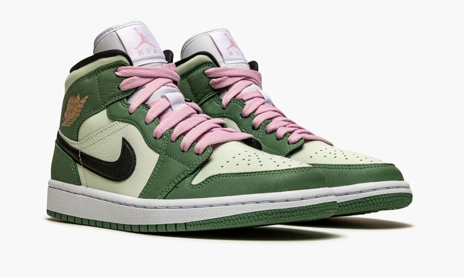 The Women’s Air Jordan 1 Mid SE “Dutch Green” is a unique look for Michael Jordan’s first signature shoe in women’s sizing. Featuring a distinctly earth tone color palette, the “Dutch Green” has a Barely Green or mint leather on the perforated toe and on the mid-panel and collar. Dutch Green leather detailing appears on the forefoot, eyelets, collar, and heel. A black leather Swoosh on the mid-panel breaks up the look. A dusty pink “Wings” logo appears on the collar and a pink Jumpman graces the tag on the white nylon tongue. Interestingly, Jordan Brand opts for pink laces here, a style move that may reference the laces found on Travis Scott’s limited Air Jordan 1 collaboration from 2019. A white midsole and Dutch Green outsole complete the look .