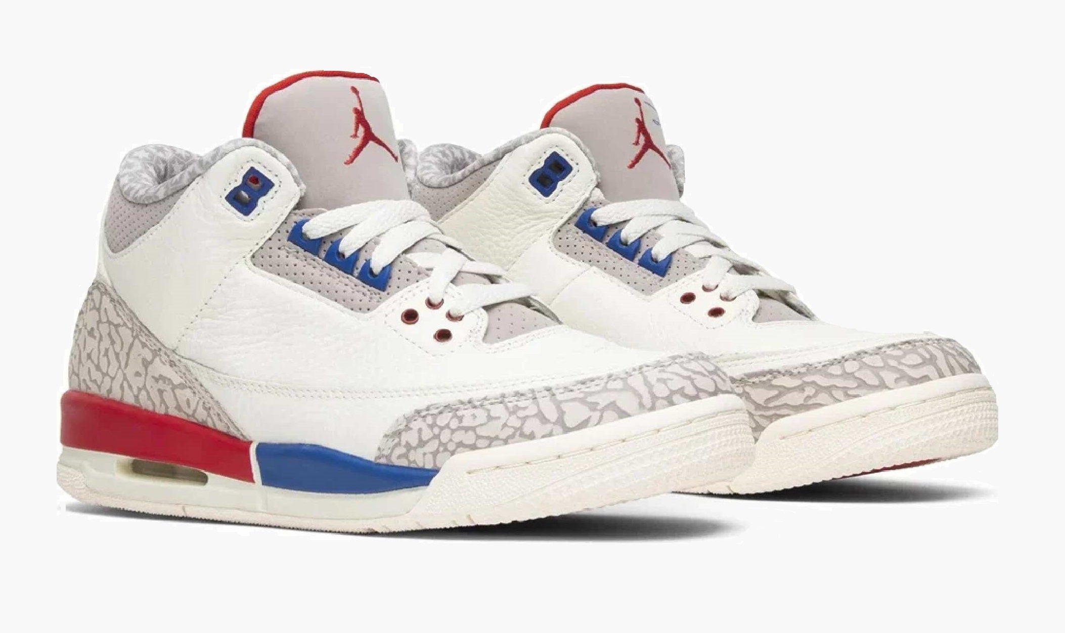 Inspired by the uniform of Michael Jordan for a charity match in 1988 in which he scored 54 points, the Air Jordan 3 Retro – International Flight sneaker sports a patriotic colour scheme on an off-white leather construction. Sport Royal accents grace the branding of Jumpman’s eyelets, midsole, and embossed heel, while Fire Red’s contrasting marks stand out on the back midsole section and Jumpman’s logo on the tongue, with Michael Jordan’s signature on the right. The Jordan elephant print signature on the toe and heel is rendered in light gray on the leather overlays.