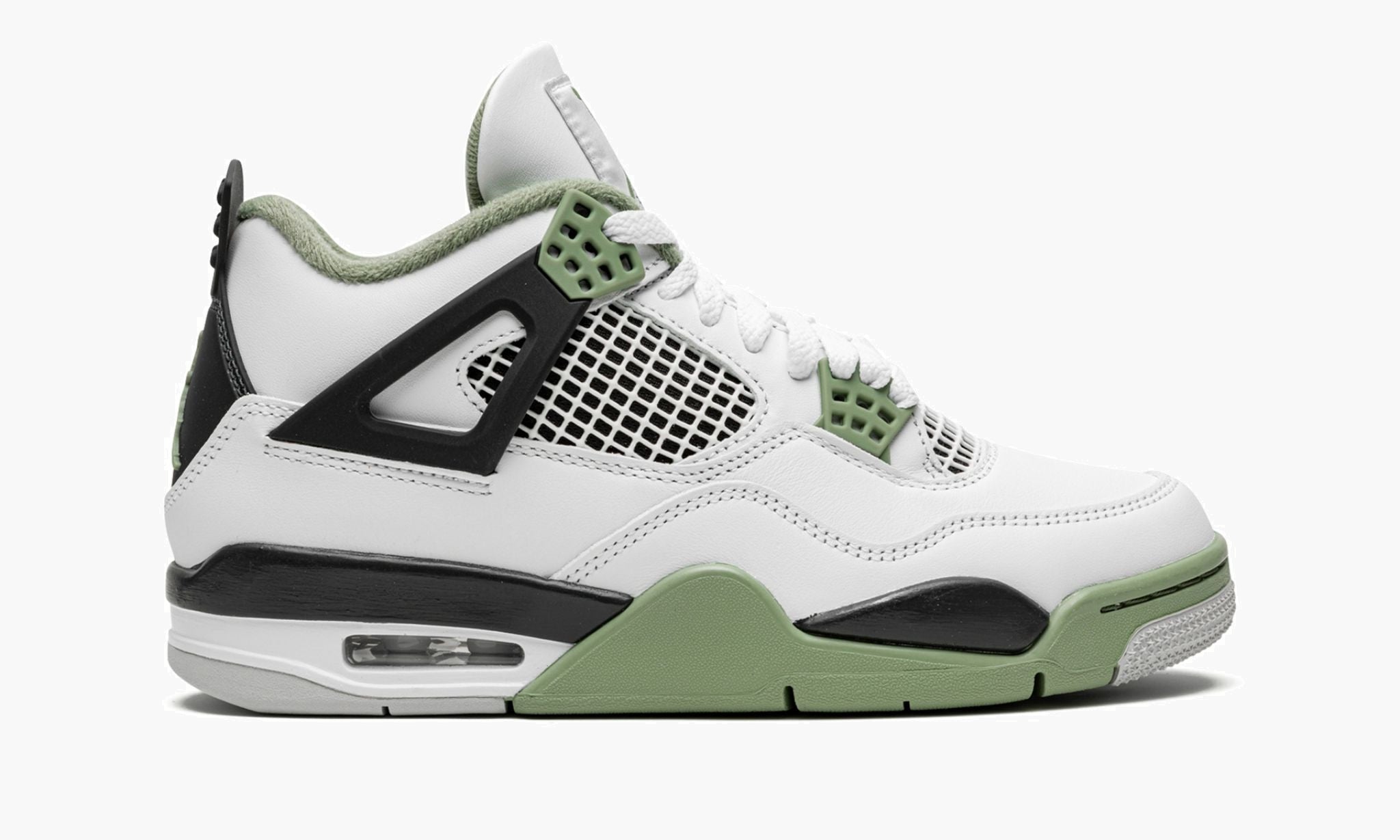 The Women’s Air Jordan 4 “Oil Green” is a women’s-exclusive colorway of the classic sneaker that adds to its impressive collection of releases. In the “Oil Green” colorway, this Jordan 4 is complete with a white leather construction with tonal netting on the tongue and mid-panel. Seafoam-colored eyelets are found on the sides of the shoe and additional Seafoam accenting appears on the Jumpman on the tongue and on the heel. The minty-green hue is also on the interior collar and on the rubber overlay on the toe and forefoot on the outsole. A visible Air bubble appears in the heel of the midsole. Release date: February 9, 2023