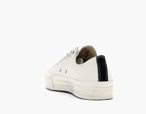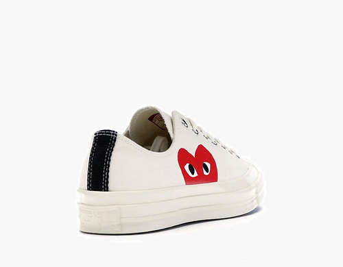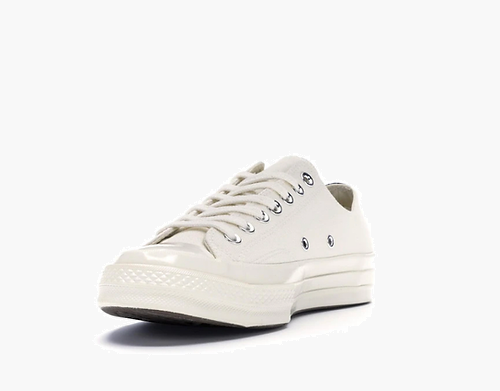 Converse Chuck Taylor All Star 70s Ox Comme des Garcons PLAY White is a low-top iconic collaboration. It blends the minimalist eye and heart logo on a white canvas. Converse Chuck Taylor All Star 70s Ox Comme des Garcons PLAY White is a special edition colorway that was designed by graphic artist Filip Pagowski and Comme des Garçons founder Rei Kawakubo. The shoe usually features a Milk canvas upper with the oversized signature CDG red heart printed on the quarter panels.