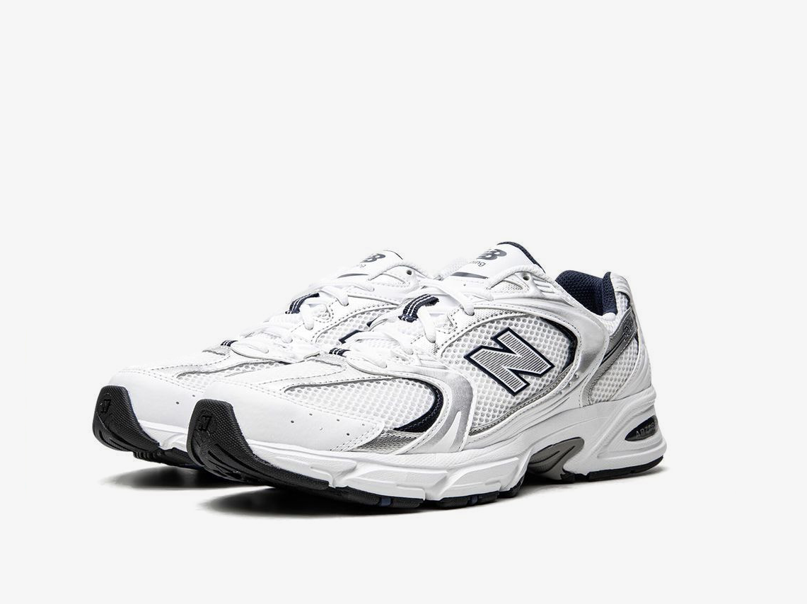 New Balance’s 530 sneakers are back – this time, in a white hue with navy blue and silver accents. This pair has a low-top silhouette, constructed with mesh panels for breathability, and is enhanced with an ‘N’ logo on the sides. Underneath, a signature ABZORB® midsole brings it better cushioning