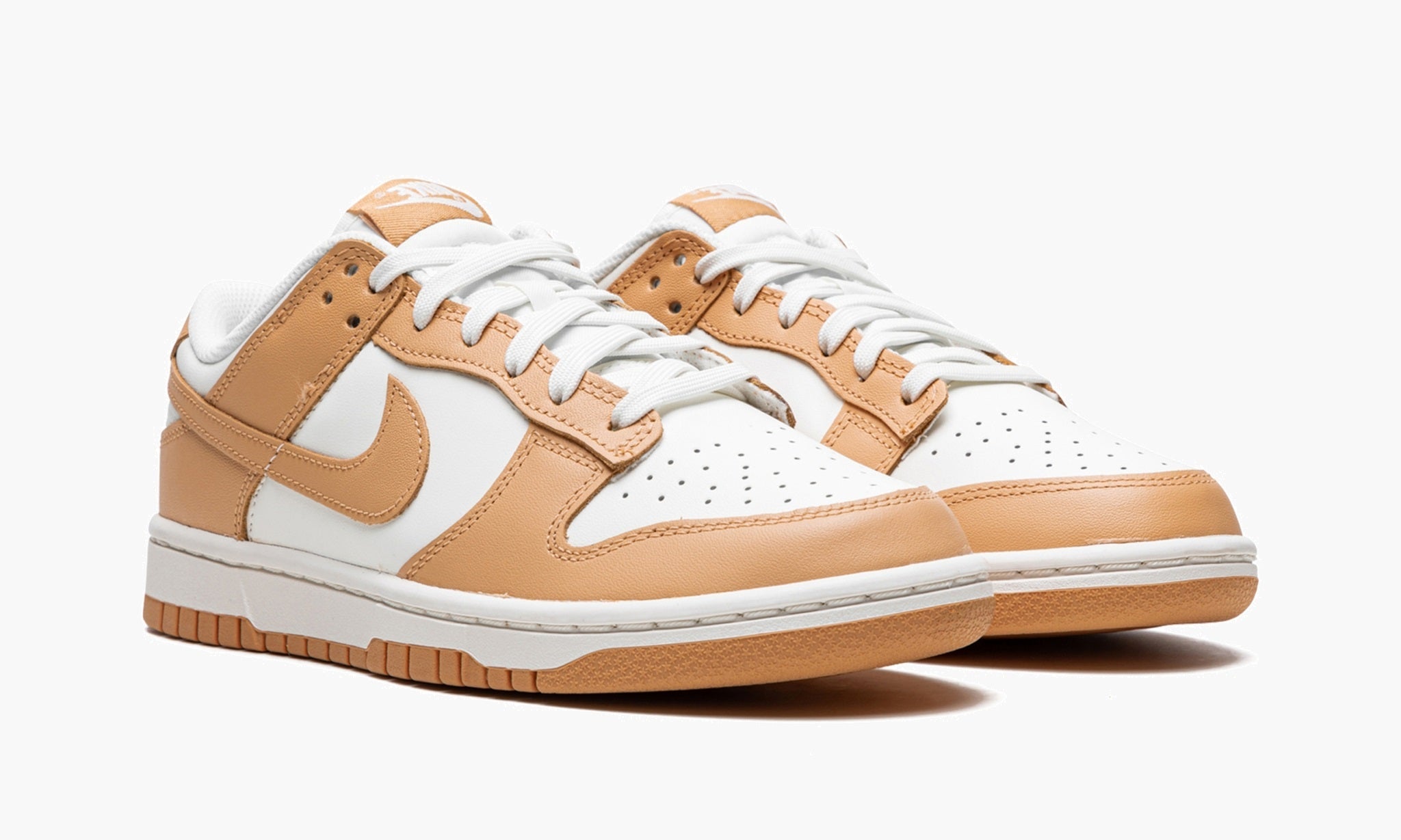 The Dunk Low – Harvest Moon dresses the retro hoops shoe in a refined two-tone color scheme, highlighted by a leather upper that combines a clean white base with contrasting overlays in a subtle peach beige hue. The sneaker is appointed with standard Dunk features, including a perforated toe box, breathable nylon tongue, and embroidered branding on the back tab. Anchoring the low-profile silhouette is a sturdy rubber cupsole, featuring white sidewalls and a beige rubber outsole.