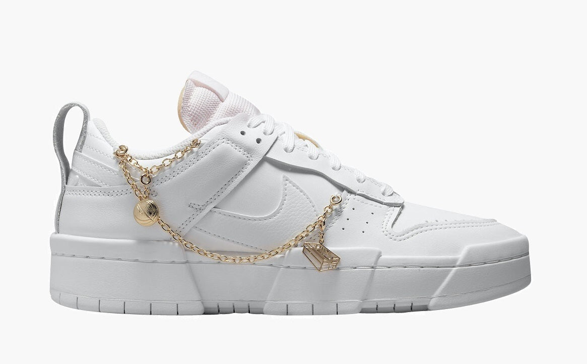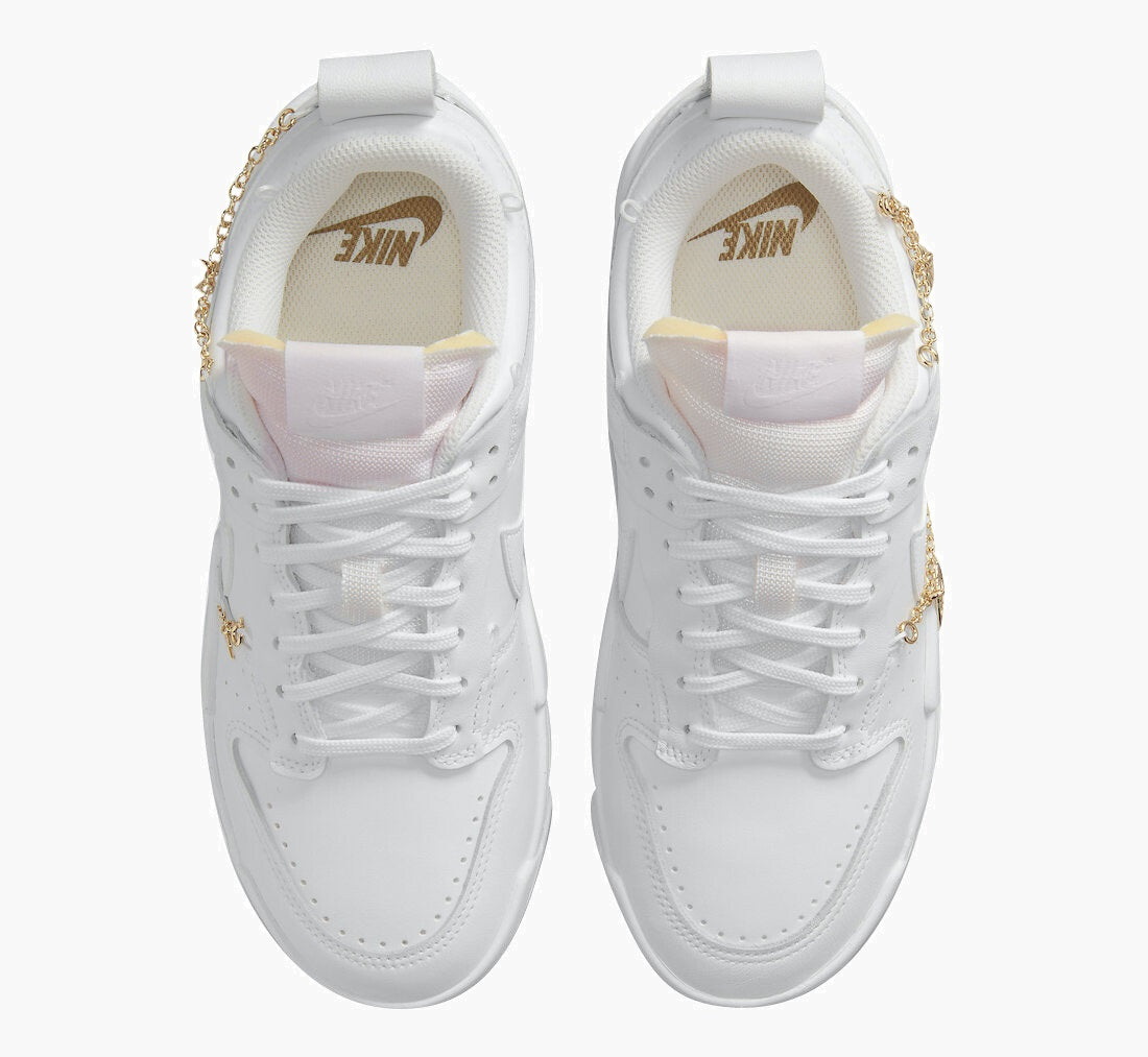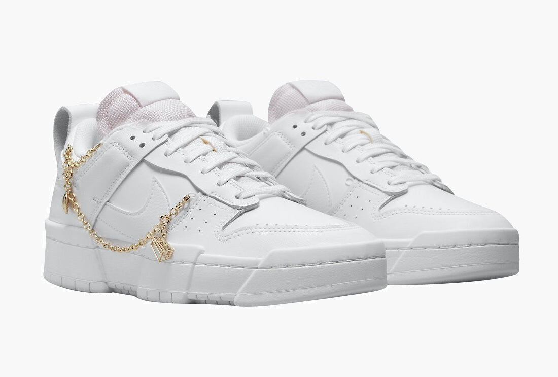 Dubbed the Nike Dunk Low Disrupt Gold Charms, this iteration of the model starts off with a White leather base paired up with mesh tongues atop a matching-colored rubber sole. The sneaker’s most notable feature are the golden Nike and basketball charms hanging down the lateral sides.